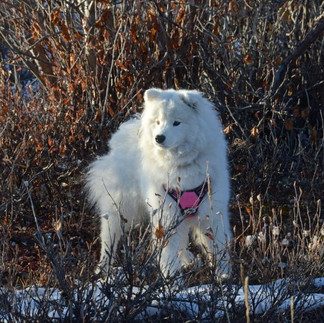 Most of the day we were socked in by low clouds but when we pulled into Galbraith the sun was shining. Took the pups for a couple of walks around the campground, there are Caribou hunters all over the place so the Sammies mostly stayed on their leads. We did let them off a few times when we were sure we could and they had a ball running around in the cold and little snow around the campground. Granger is just full of himself acting like he owns the place and strutting around. Moxee is as usual this trip loving all the new things she is seeing, smelling and hearing.